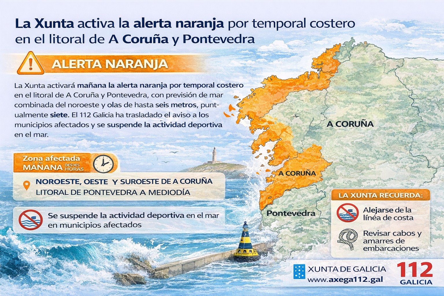 La Xunta activará mañana la alerta naranja por temporal costero en el litoral de las provincias de A Coruña y Pontevedra, ante la previsión de un episodio de mar adversa. Con el objetivo de garantizar la seguridad de las personas y los bienes, la Dirección Xeral de Emerxencias e Interior, dependiente de la Consellería de Presidencia, Xustiza e Deportes, ha informado de la situación a través del Centro Integrado de Atención ás Emerxencias 112 Galicia a los ayuntamientos de las zonas afectadas, diputaciones, servicios provinciales, agrupaciones de voluntarios de Protección Civil y clubes náuticos, entre otros.