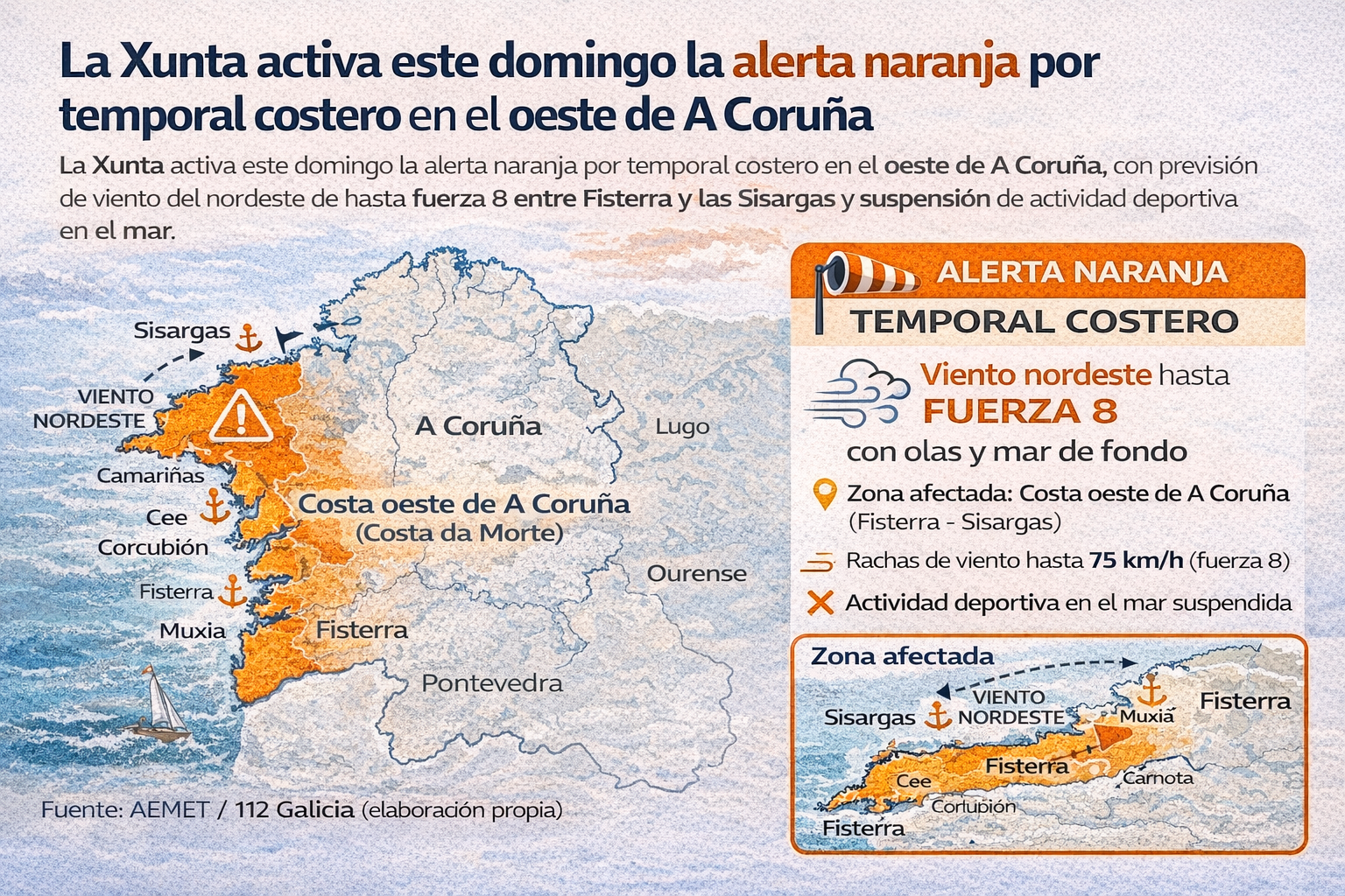La Xunta de Galicia ha activado para este domingo la alerta naranja por temporal costero en el oeste de la provincia de A Coruña. Con el fin de garantizar la seguridad de los bienes y las personas, la Dirección Xeral de Emerxencias e Interior, de la Consellería de Presidencia, Xustiza e Deportes, informó de la situación a través del Centro Integrado de Atención ás Emerxencias 112 Galicia a los ayuntamientos de las provincias afectadas, diputaciones, servicios provinciales y agrupaciones de voluntarios de Protección Civil, así como a clubes náuticos, entre otros.