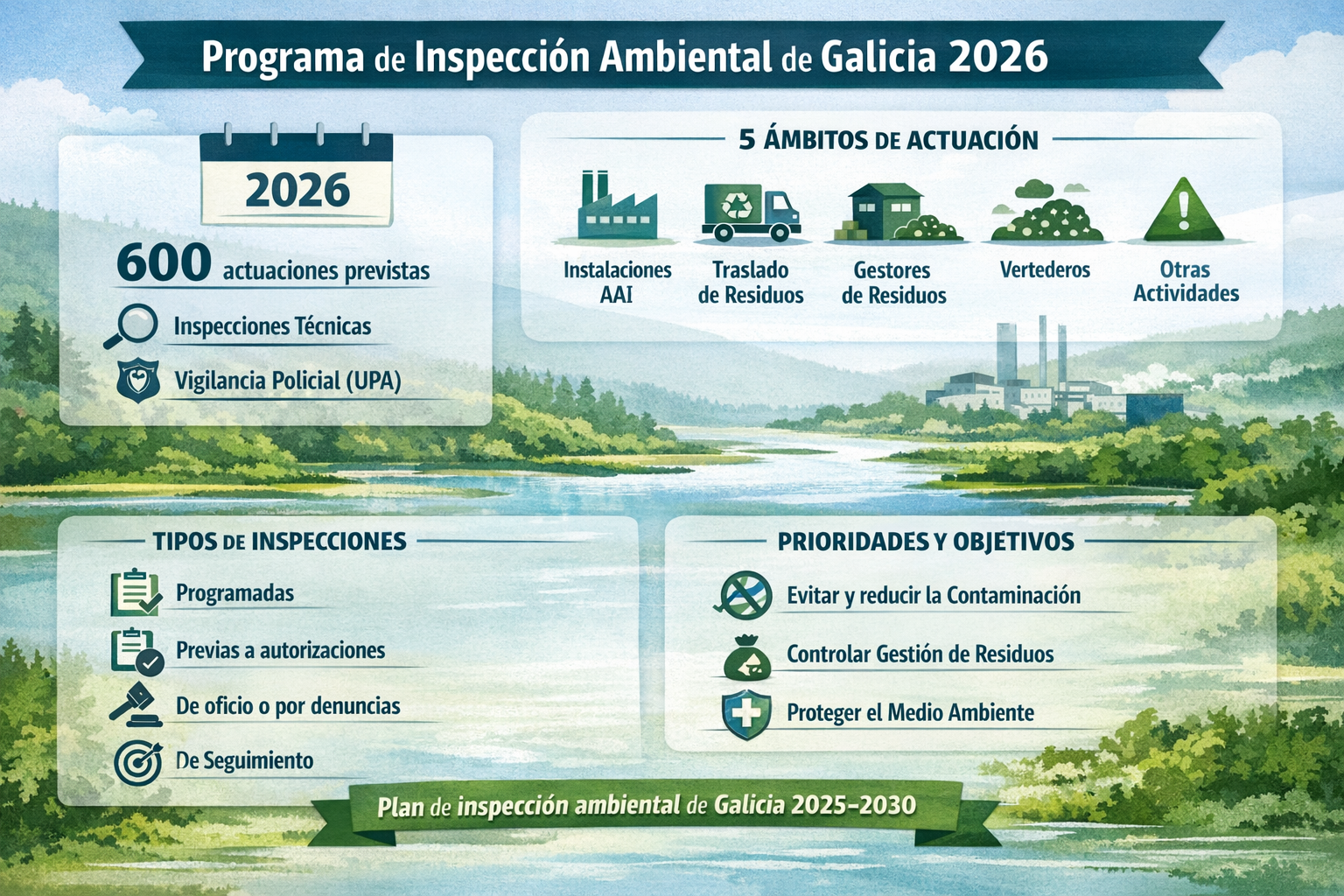 El programa se enmarca en el Plan de inspección ambiental de Galicia 2025-2030 y establece cinco grandes ámbitos de actuación, en función del tipo de actividad sometida a vigilancia: instalaciones con autorización ambiental integrada (AAI), traslado de residuos, gestores de residuos, vertederos y otras actividades susceptibles de contaminación.