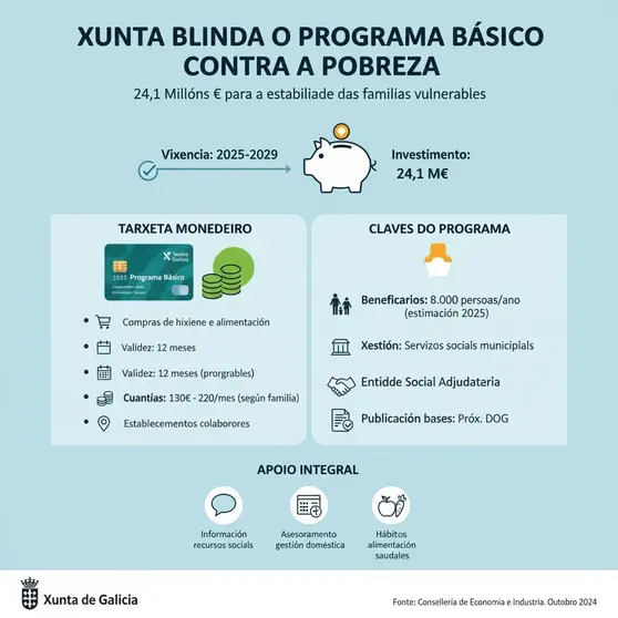 El presidente de la Xunta de Galicia, Alfonso Rueda, anunció hoy que el Consello ha dado "luz verde al concierto social para la gestión del Programa Básico", una medida que dota de estabilidad y flexibilidad a la principal iniciativa de apoyo a familias vulnerables de la comunidad. El acuerdo contempla una inversión de 24,1 millones de euros y tendrá una vigencia de cuatro años, hasta junio de 2029.