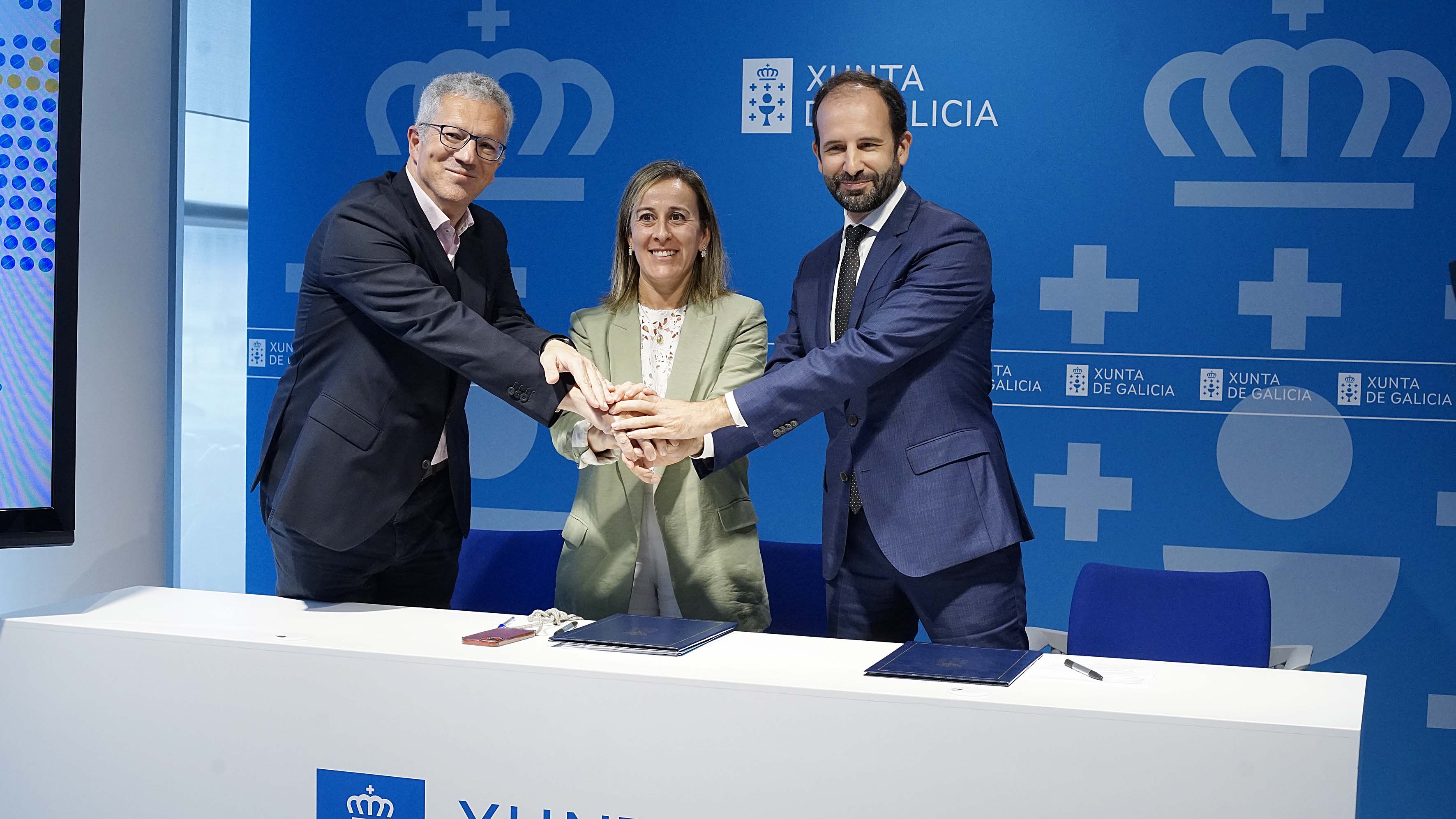 La conselleira de Infraestruturas e Mobilidade, Ethel Vázquez, y el presidente del Clúster da Función Loxística de Galicia, Xoán Martínez, firmaron hoy el convenio de colaboración entre la Xunta y la asociación para el impulso del Corredor Atlántico Noroeste. También participó en el acto el director xeral de Mobilidade, Ignacio Maestro.
