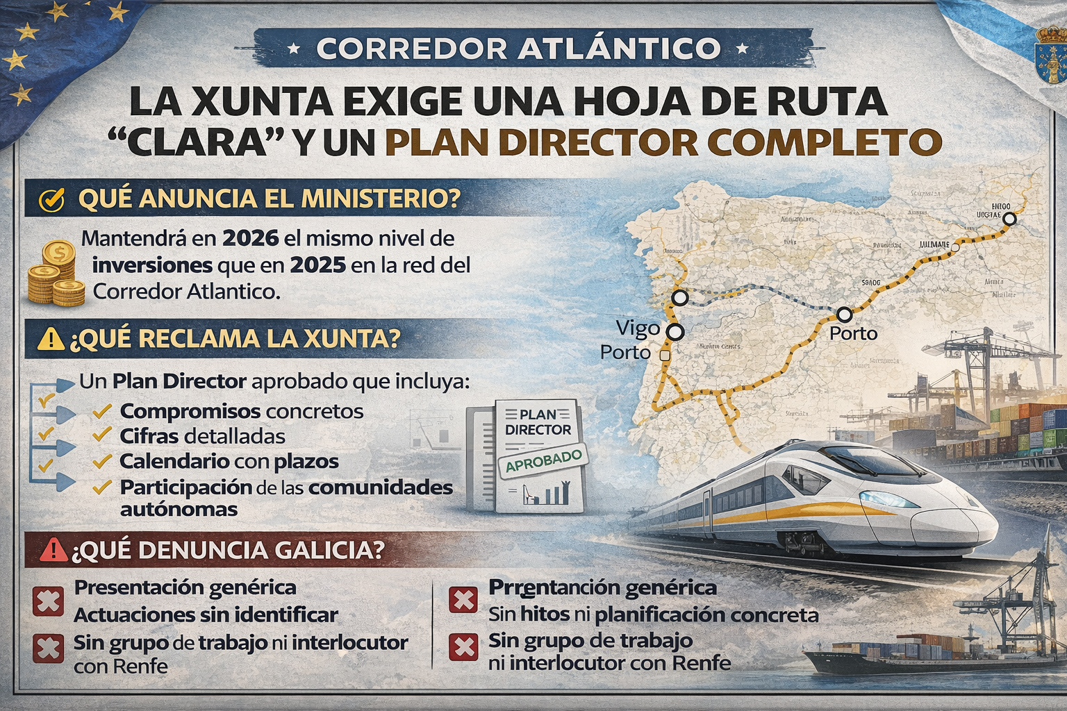 La Xunta reitera el carácter estratégico del Corredor Atlántico, señalado como prioritario por la Unión Europea, e insiste en que el Plan Director debe incluir también una hoja de ruta específica para la alta velocidad entre Vigo y Oporto, así como la consideración de Vigo y Ferrol como puertos nodales dentro de la red logística y ferroviaria.