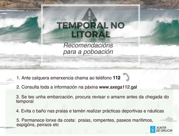 La Xunta recuerda la importancia de mantenerse alejado de la línea de costa, esto es, diques, rompentes, paseos marítimos. También se recomienda que se extremen las medidas de seguridad a la hora de realizar cualquier actividad en el mar y que se revisen los cabos y amarres de las embarcaciones. Además, se aconseja consultar la página web del CIAE 112 (www.112galicia.org), que cuenta con información meteorológica y con enlaces de interés.
