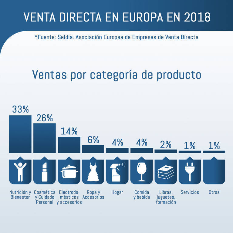 Las categorías que más se venden en la Venta Directa son productos del sector de la nutrición y el bienestar (33% del mercado), cosmética y cuidado personal (26%), cuidado del hogar (14%), y ropa y accesorios (6%). El resto (21%) del mercado está representado por la venta de alimentos y bebidas, artículos culturales y telecomunicaciones, entre otros.