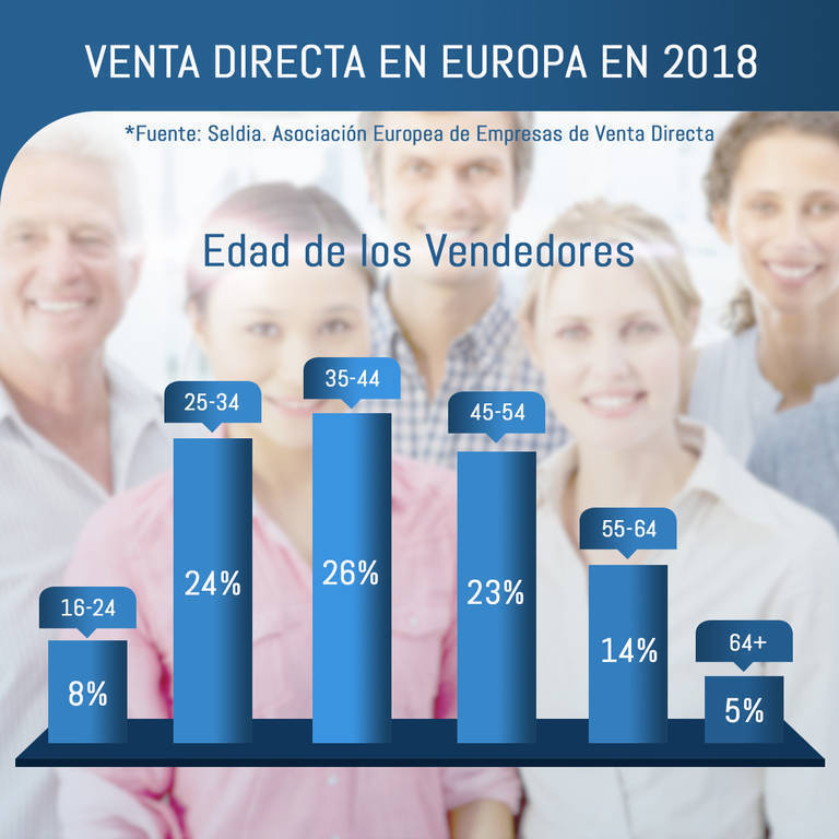 Las personas que se dedican a la venta directa en Europa ascienden a 14.3 millones (6.8 millones en países de la Unión Europea). De estos, un 80% son emprendedores que se dedican a esta actividad a tiempo parcial -menos de 30 horas semanales- y 78% son mujeres. Se trata en su gran mayoría de personas jóvenes, pues 6 de cada 10 vendedores de la venta directa en Europa tiene edades comprendidas entre los 16 y los 44 años.
