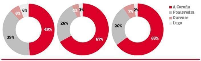 A Coruña es la provincia con mayor peso en Galicia por número de empresas: representa el 49% del total, que acumulan un 67% de los ingresos y el 65% del empleo. En un segundo nivel se situa Pontevedra, con un 39% de las empresas y un 26% de los ingresos y empleos creados. Lugo es la provincia gallega más infrarepresentada en el Ranking.