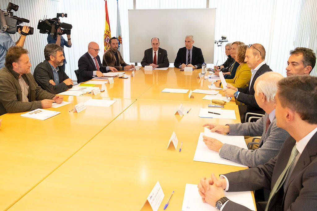 El conselleiro de Sanidad, Jesús Vázquez Almuiña, y el conselleiro de Economía, Empleo e Industria, Francisco Conde, mantuvieron hoy un encuentro con miembros de la Confederación de Empresarios de Galicia y representantes sindicales (CC.OO., UGT y CIG) para abordar la situación actual del coronavirus en Galicia.