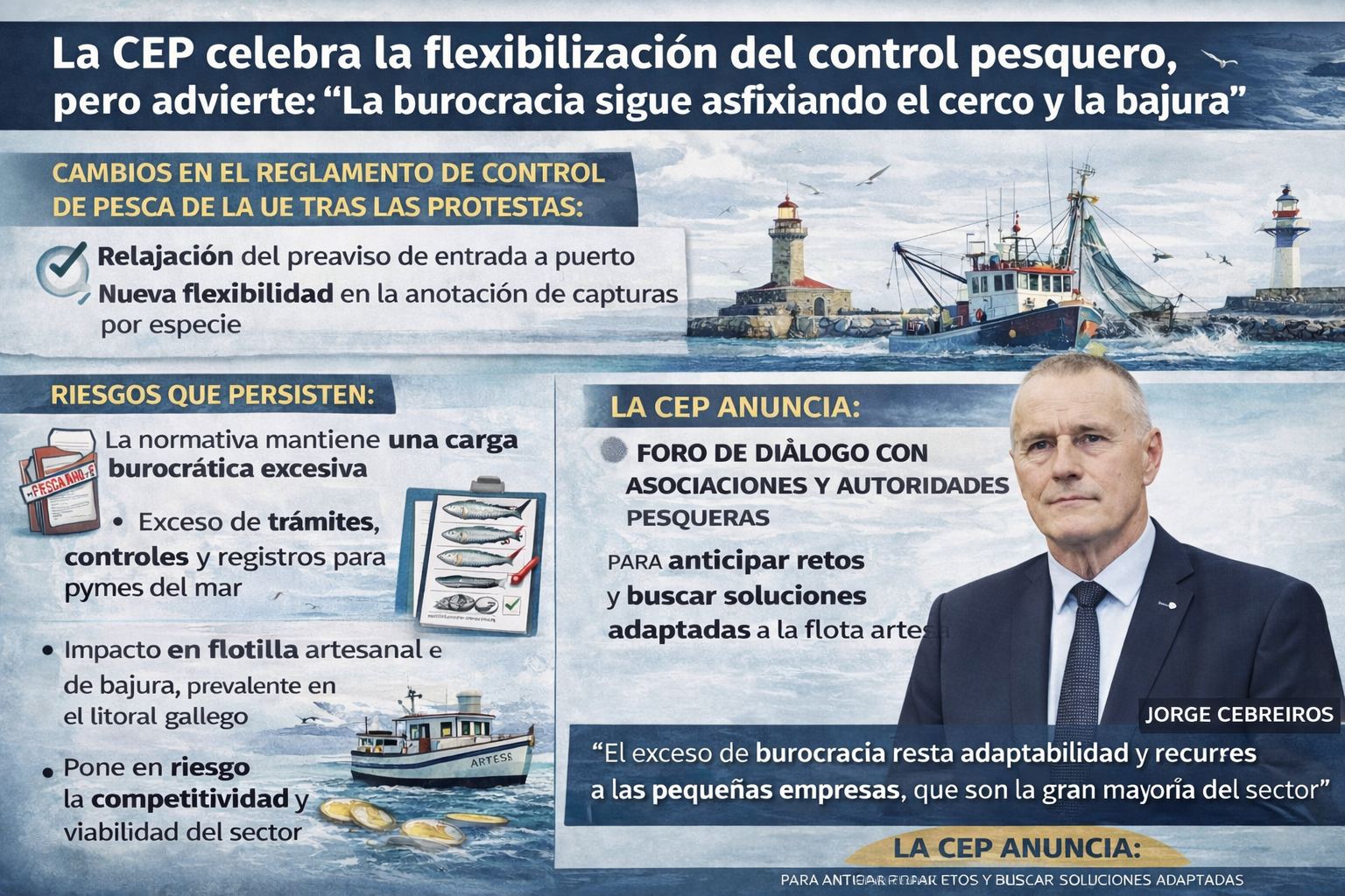 La Confederación Empresarial de Pontevedra (CEP), que agrupa a asociaciones vinculadas al sector marítimo-pesquero, ha recibido con satisfacción la flexibilización aplicada al nuevo Reglamento de Control de Pesca de la Unión Europea, en vigor desde el pasado 10 de enero. La organización considera que las movilizaciones y el malestar expresado por el sector han tenido efecto, al suavizarse algunas exigencias que, a su juicio, resultaban discriminatorias para la flota artesanal y de bajura.
