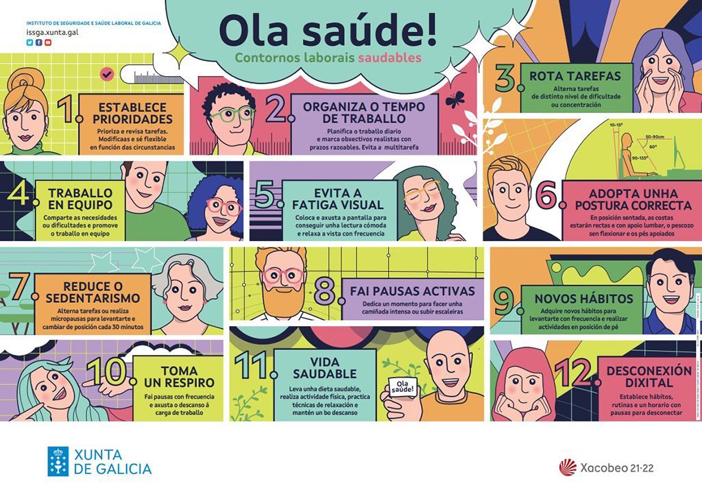 La Xunta está promocionando la creación de entornos laborales saludables que permitan proteger, promover y apoyar la seguridad y salud en el trabajo y el bienestar de las personas trabajadoras por medio de la nueva campaña ‘Ola saude!' del Instituto de Seguridad y Salud Laboral de Galicia (Issga).