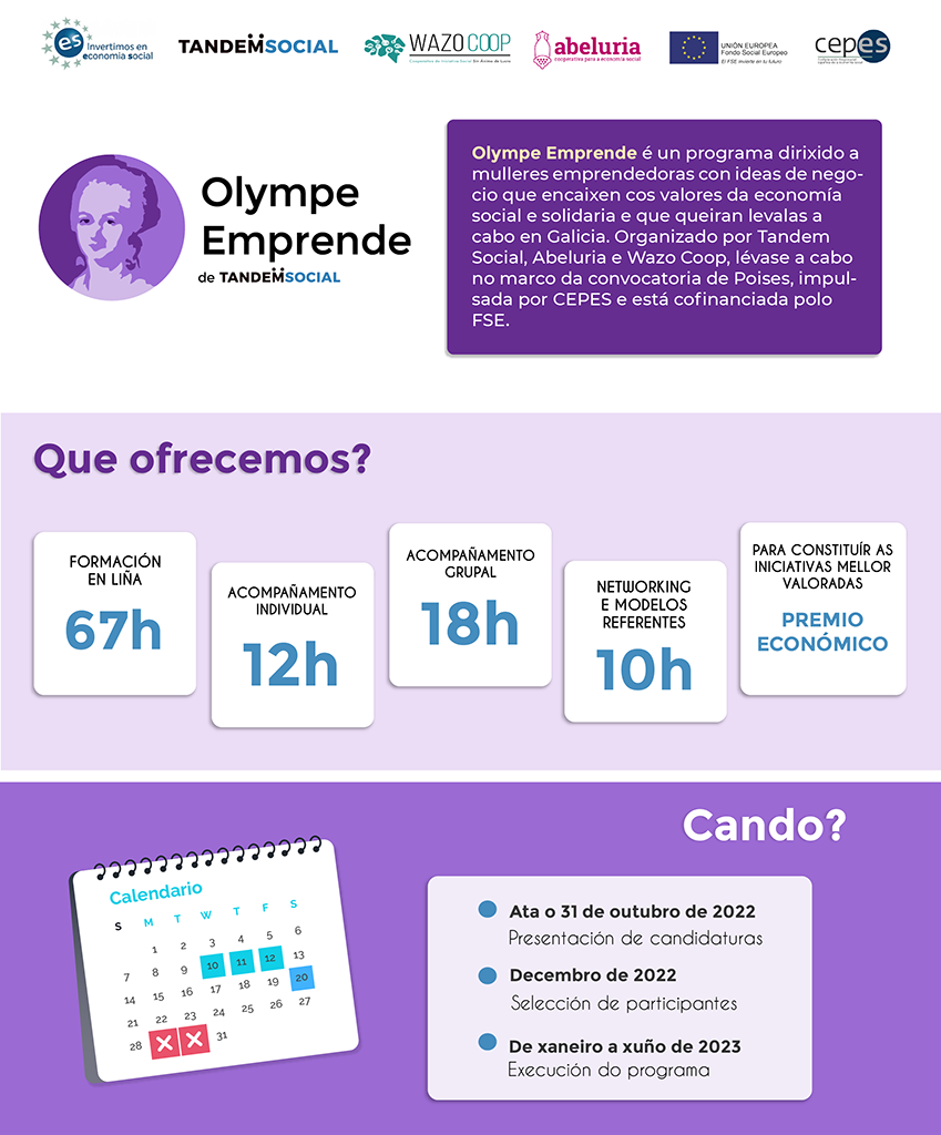 O Programa #OlympeEmprende liderado por Tandem Social, Abeluria e Wazo Coop é unha iniciativa que apoiará o emprendemento en feminino con valores e principios de economía social e solidaria en Galicia a través da formación con perspectiva de xénero, o acompañamento individual e colectivo e a conexión de experiencias emprendedoras a nivel local.
