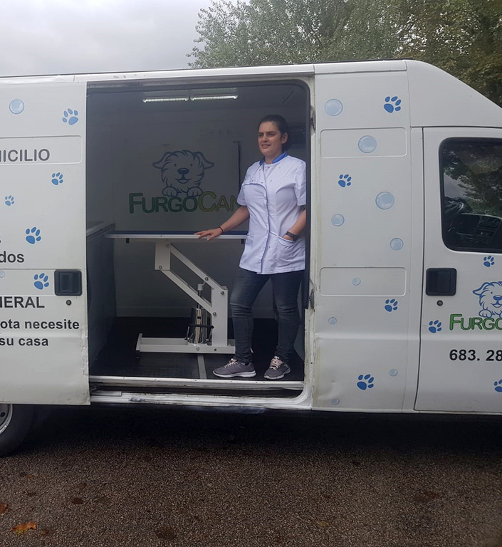 Mayra Adón, de 35 anos e veciña da parroquia de Dornelas, é a creadora de FurgoCan, unha perruquería canina móbil que foi o primeiro dos negocios innovadores mosenses desta pandemia. Botou a andar ao comezo da crise sanitaria.