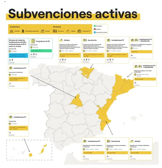 La transición energética es más accesible que nunca gracias a la variedad de ayudas y subvenciones disponibles. Para facilitar este proceso, SotySolar ha creado un mapa nacional que recopila de forma periódica todas las subvenciones y bonificaciones activas, tanto a nivel nacional como autonómico, para la instalación de sistemas como la energía solar fotovoltaica, aerotermia y cargadores para vehículos eléctricos.