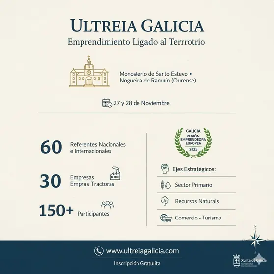La Consellería de Emprego, Comercio e Emigración organizará los próximos 27 y 28 de noviembre el encuentro de emprendimiento Ultreia Galicia, emprendimiento ligado al territorio, que tendrá lugar en el emblemático Monasterio de Santo Estevo de Ribas de Sil, en Nogueira de Ramuín (Ourense).