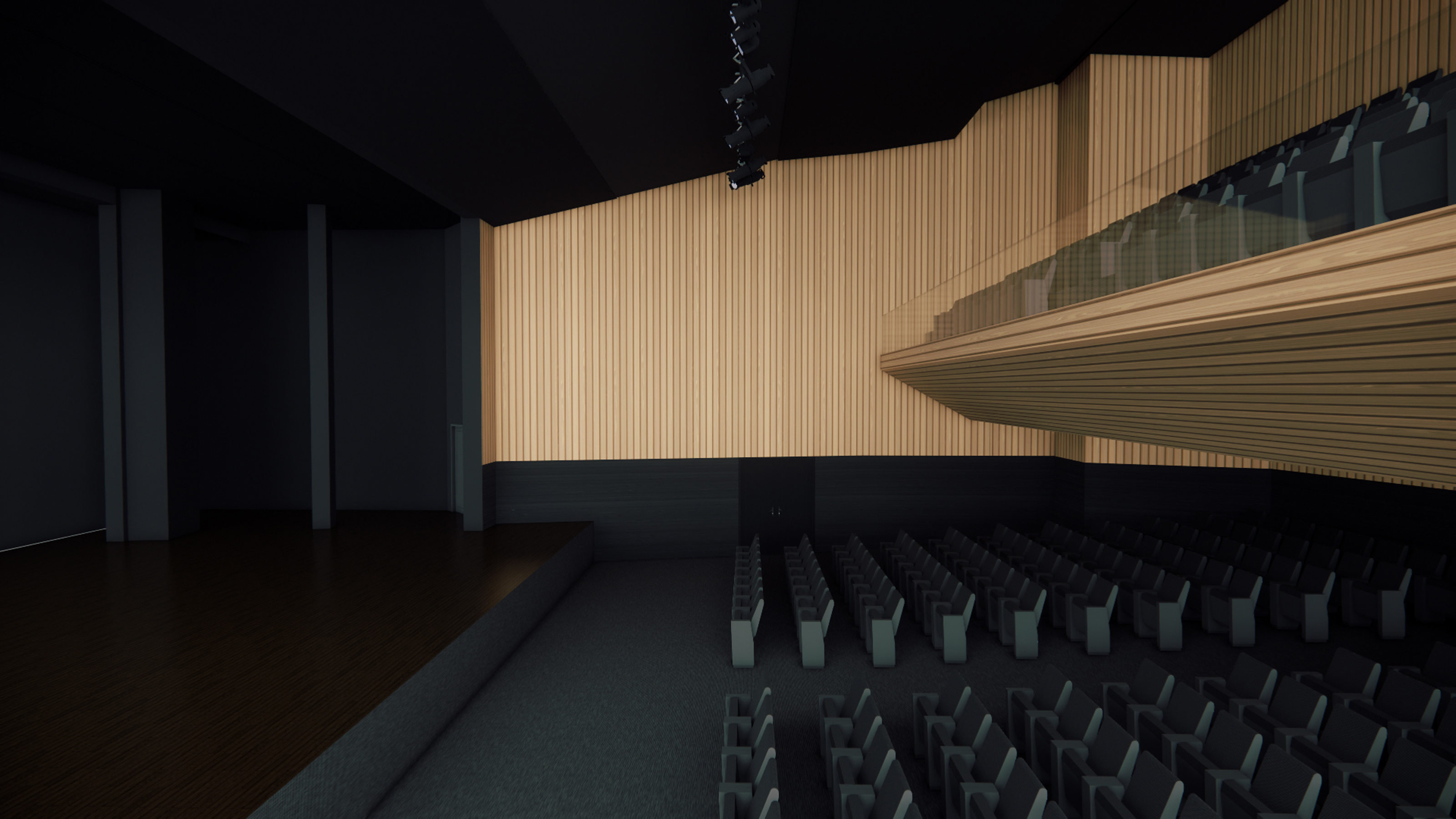 O primeiro andar contará com um "foyer" com áreas de exposição e um balcão aberto sobre a plateia, com estrutura amovível para acomodar os 104 lugares sentados. A sala principal será o coração do edifício, permitindo uma abordagem cénica ampla e o uso de novas tecnologias para uma experiência sensorial única.