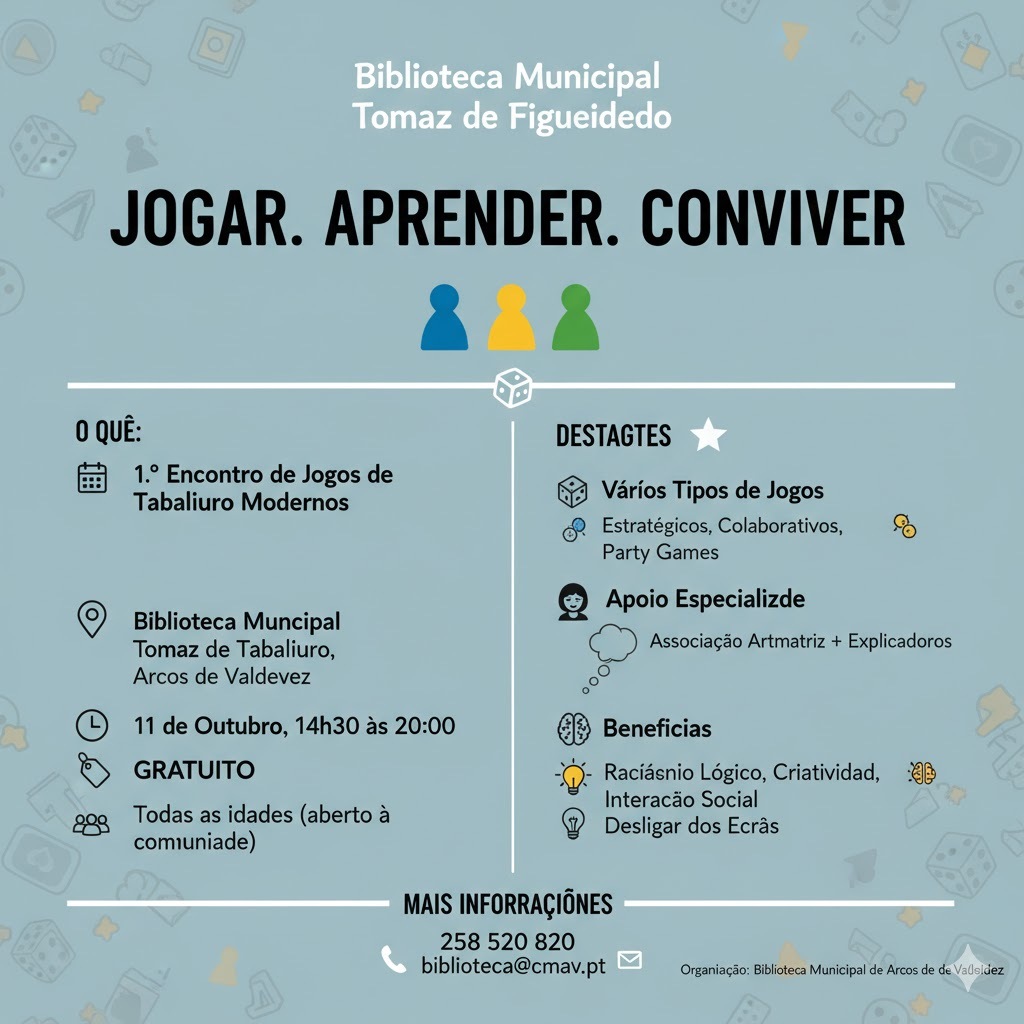 A Biblioteca Municipal Tomaz de Figueiredo, em Arcos de Valdevez, vai ser palco do primeiro Encontro de Jogos de Tabuleiro Modernos do concelho. O evento, de entrada livre e aberto a toda a comunidade, visa promover o convívio intergeracional e os benefícios cognitivos do jogo.