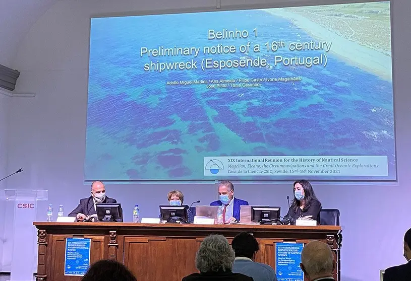 Após a sessão inaugural e de homenagem ao Professor Francisco Contente Domingues, na manhã de segunda feira, foi apresentada a comunicação “The Belinho 1: preliminary notice on a 16th century shipwreck (Esposende, Portugal)” - Belinho 1: notícia preliminar de um naufrágio do século XVI, integrada na sessão 1 “Naufragios y arqueología subacuática. Shipwrecks and uderwater archaeology”.