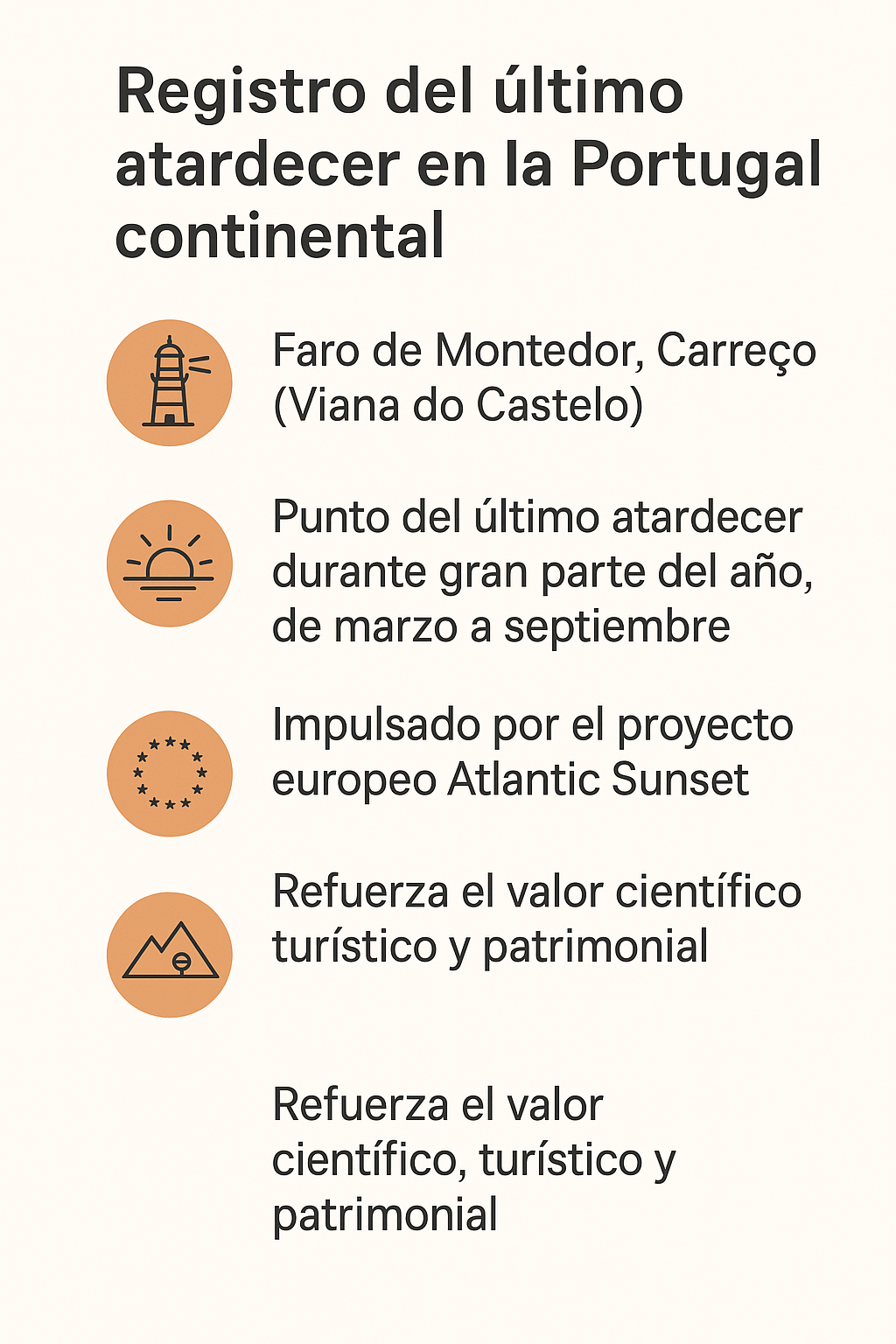 El emblemático Faro de Montedor, situado en la freguesia de Carreço (Viana do Castelo), cuenta desde este mes con una placa conmemorativa y una mesa interpretativa que reconocen el lugar como el punto donde se observa el último atardecer de Portugal continental durante casi medio año, entre la primavera y el verano. La iniciativa forma parte del proyecto europeo Atlantic Sunset, liderado por la Fundación CEER, destinado a promover la cooperación territorial, la ciencia, el turismo sostenible y la valorización del patrimonio natural del Arco Atlántico.
