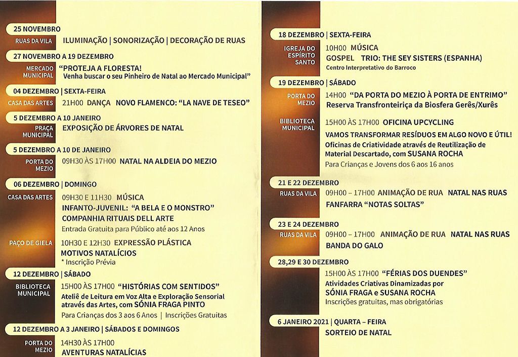 A programação desta “Magia de Natal” arrancou esta quarta-feira, com o acender das luzes natalícias em vários pontos da vila. Entre outros eventos engloba, no âmbito da iniciativa ‘Proteja a Floresta, de 27 de Novembro a 19 de Dezembro, a distribuição gratuita no Mercado Municipal de pinheirinhos de Natal; No dia 4 de Dezembro, a Casa das Artes recebe, a partir das 21 horas, o espetáculo Novo Flamengo ‘La Nave de Teseo’; As várias árvores de Natal feitas pelas diferentes instituições do concelho estarão em exposição de 5 de Dezembro a 10 de Janeiro, na Praça Municipal; A Porta do Mezio serve de palco ao Natal na Aldeia do Mezio; O espetáculo infanto-juvenil ‘A Bela e o Monstro, da Companhia Rituais dell Arte, sobe ao palco da Casa das Artes, às 09.30 horas e às 11 horas, do dia 6 de Dezembro. A entrada é gratuita para jovens até aos 12 anos; No mesmo dia, o Paço de Giela serve de palco à iniciativa ‘Expressão Plástica - Motivos Natalícios’. O evento decorre às 10.30 horas e às 12.30 horas e exige inscrição prévia. No dia 12 de Dezembro, na Biblioteca Municipal decorre a atividade ‘Histórias com Sentidos’. O ateliêr de Leitura em Voz Alta e Exploração Sensorial destina-se a crianças dos três aos seis anos; As Aventuras Natalícias decorrem de 12 de Dezembro a 3 de Janeiro (aos sábados e domingos), na Porta do Mezio. O espetáculo Gospel Trio: The Sey Sisters decorrerá a 18 de Dezembro, na Igreja do Espírito Santo. Para dia 19 de Dezembro está reservada a iniciativa ‘Da Porta do Mezio à Porta de Entrimo’, na Porta do Mezio. Nesse mesmo dia decorre a oficina de transformação de resíduos na Biblioteca Municipal. Nos dias 21 e 22 de Dezembro a fanfarra ‘Notas Soltas’ anima as ruas da vila. Nos dias 28,29 e 30 de Dezembro decorrem as ‘Férias de Duendes’. A programação termina a 6 de Janeiro com o Sorteio de Natal. Este ano a campanha conta com 20 empresas patrocinadoras e o valor total dos prémios ultrapassa os 9 mil euros, sendo que serão sorteados 20 cheques com valores entre os 100 e os 2500 euros.