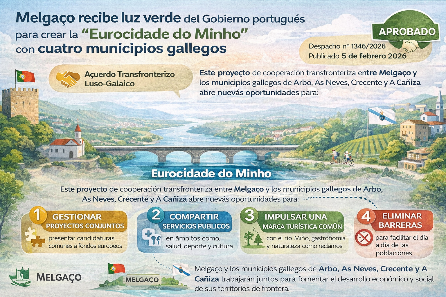 l Municipio de Melgaço ha recibido la autorización del Gobierno portugués para avanzar con la constitución oficial de la “Eurocidade do Minho”, una iniciativa de cooperación transfronteriza con los municipios gallegos de Arbo, As Neves, Crecente y A Cañiza. La decisión valida la celebración del Protocolo de Cooperación Transfronteriza entre estas cinco entidades locales y marca el inicio de una nueva etapa en las relaciones ibéricas de la región.