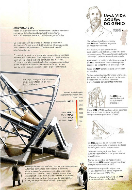 O Pirelióforo, a fantástica máquina solar, como protagonista deste artigo, representa uma das invenções do percurso excecional deste cientista, tendo-lhe garantido, em 1904, o Grande Prémio da Exposição Internacional de St. Louis, nos EUA. Este engenho “tinha como objetivo o aproveitamento industrial e agrícola do calor do Sol, uma visão revolucionária das energias renováveis no início do século XX”, realça a publicação.