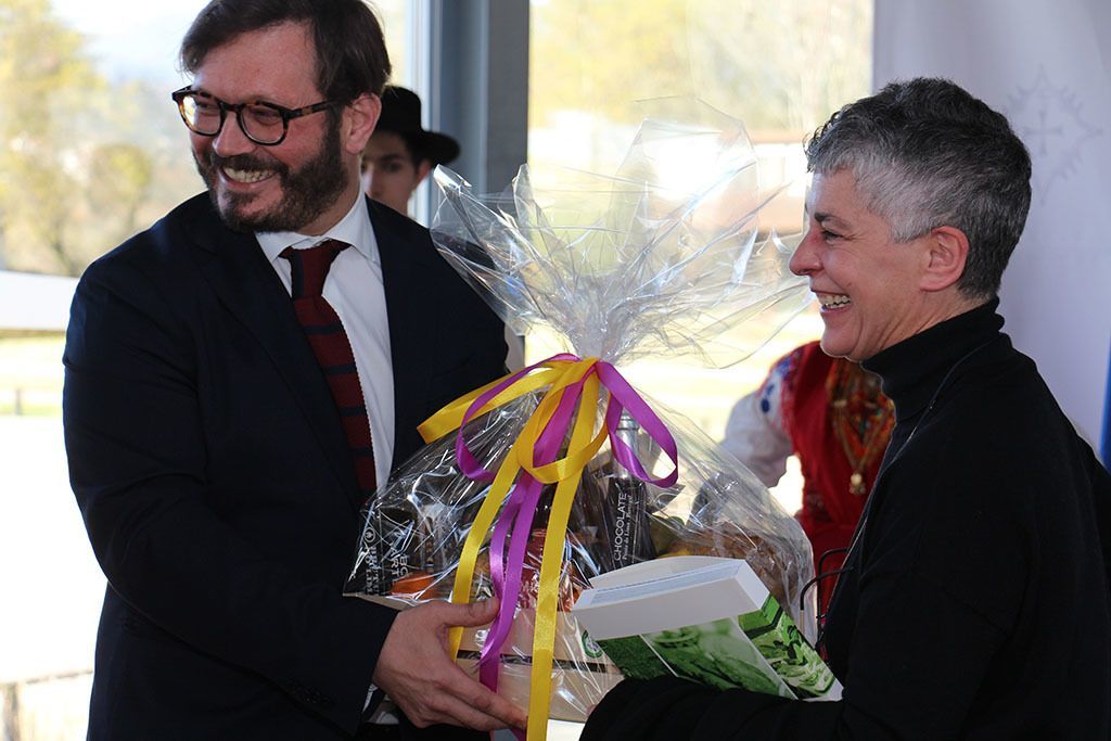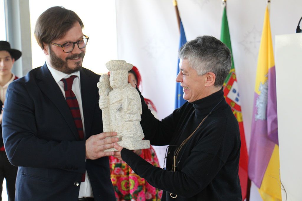 Laura Castro recibe de manos de Vasco Ferrás una escultura en piedra de Santiago Apóstol peregrino.