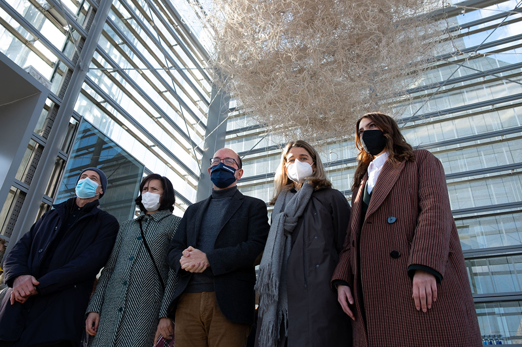 El representante de la Xunta de Galicia estuvo acompañado en este acto por la directora gerente de la Cidade da Cultura, Ana Isabel Vázquez; por Ana Luengo y Jaime Luengo (en representación del equipo de artistas); y por Sonia Delpont, directora de Comunicación y Marketing de Viaqua. El proyecto cuenta con el patrocinio de esta entidad, al igual que las cuatro anteriores intervenciones paisajísticas realizadas en las Torres Hejduk y vinculadas con los paisajes culturales, la naturaleza y la concienciación ambiental: El perpetuo tránsito hacia el presente, de Miguel Moreno Mateos; Paisajes incultas, de Cristina García Fontán; Plástico a mareas, de María José Arceo; y Betula Pendula, de Martín Toimil.