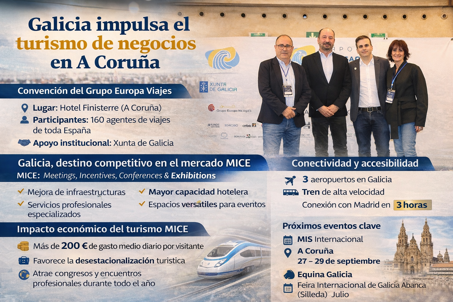En su intervención, elogió además el papel de A Coruña como referente en el turismo MICE, al recordar la celebración del próximo MIS Internacional, que tendrá lugar en la ciudad herculina entre el 27 y el 29 de septiembre. Este encuentro es uno de los principales foros del sector y reúne a organizadores internacionales de eventos, destinos y empresas especializadas en turismo de negocios.