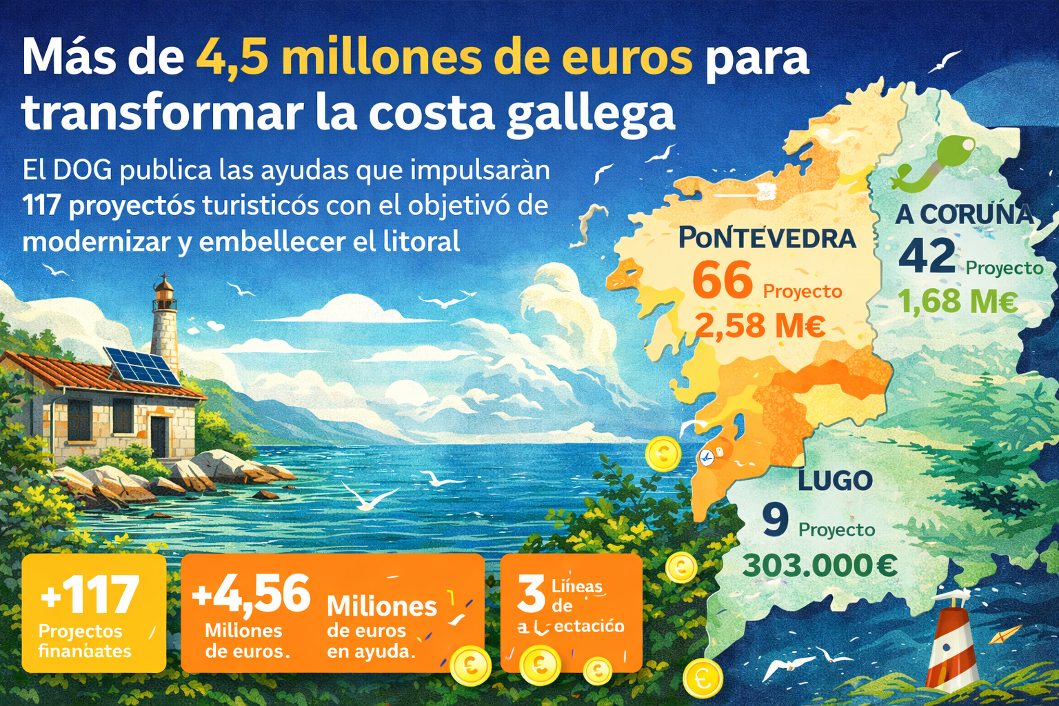 Estas subvenciones, financiadas íntegramente con fondos europeos NextGenerationEU, buscan mejorar la imagen, sostenibilidad y competitividad de la costa gallega.