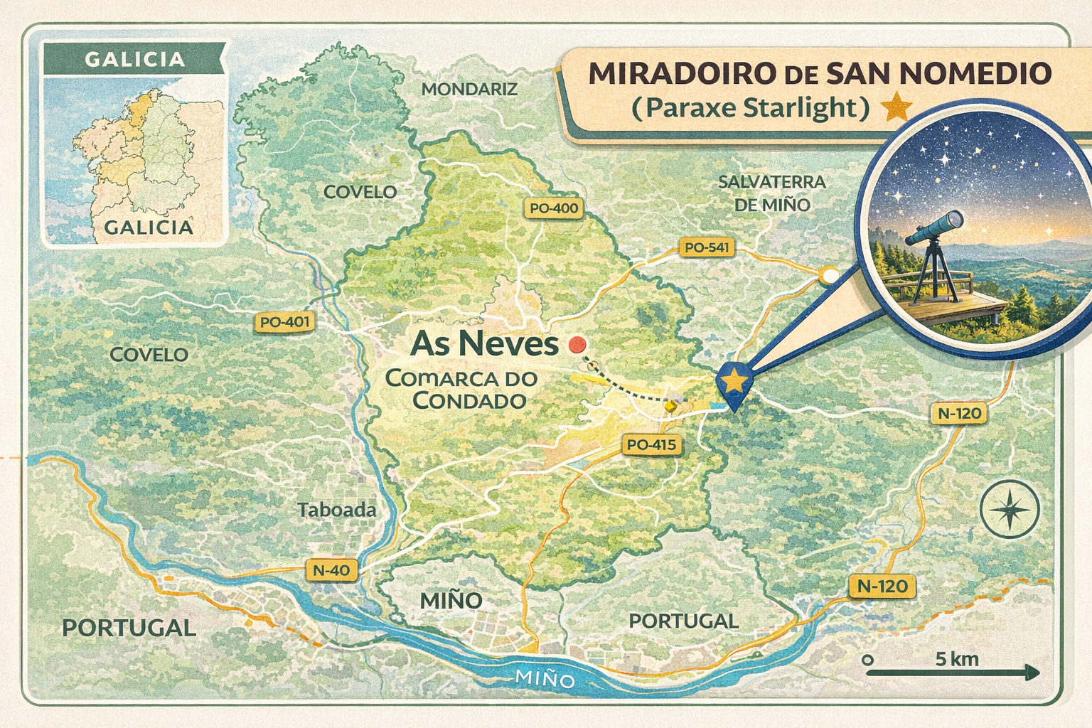 O miradoiro de San Nomedio, no Concello de As Neves, vén de acadar a certificación “Paraxe Starlight”, un recoñecemento que avala a excelente calidade do ceo nocturno e as condicións idóneas da contorna para a observación astronómica e o desenvolvemento do astroturismo.