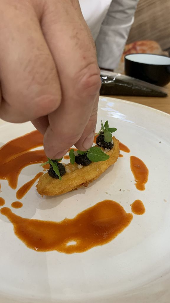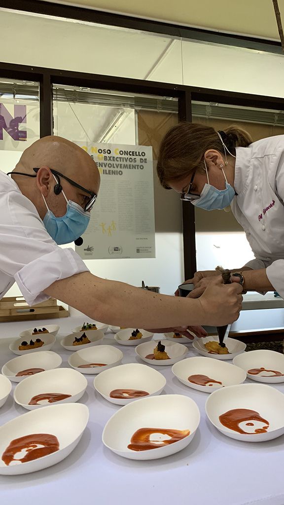 Mosteiro apostó por el trampantojo, con un churro elaborado con patata, recuerdo de tiempos pasados en los que, por falta de cereal, no era extraño que se elaborasen churros con este tubérculo. Menta, mostaza y queso Galmesano -el parmesano gallego completaron la elaboración de este particular churro. Y si hablamos de churros, no puede faltar el chocolate. Mosteiro lo simuló en su plato con una mousse de guiso de chocos en su tinta y recordó cómo la captura del choco sustituye a la de la lamprea cuando esta acaba su temporada.