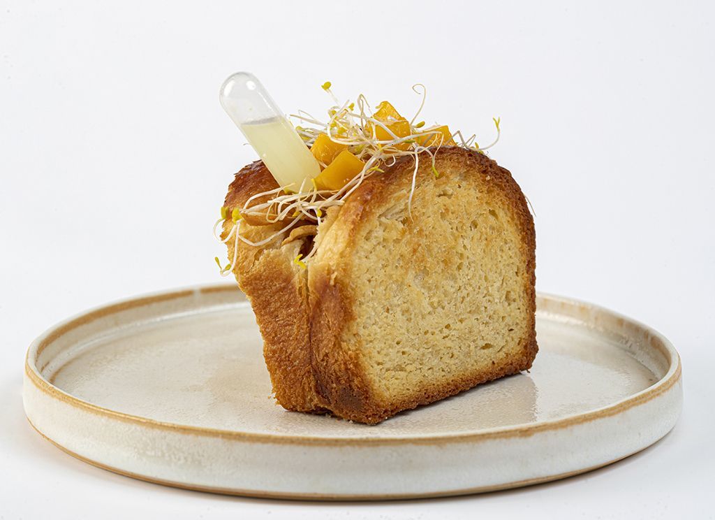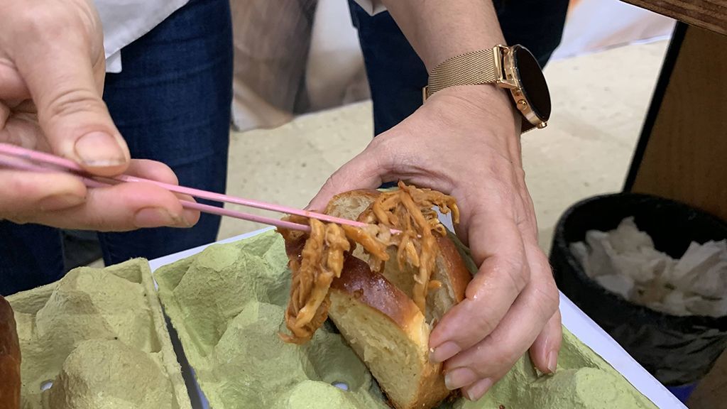 El resultado fue una carne melosa y muy desmigada, que se sirvió acompañada de cebolla crujiente, salsa barbacoa, germinados de alfalfa -para un toque fresco y algo picante- y dados de mango, como contrapunto dulce y frutal. El bocadillo se presentó con una pipeta de lima, que los asistentes pudieron utilizar a su gusto, añadiéndole