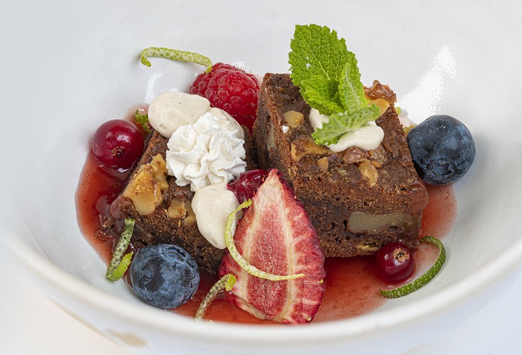 Para acompañar el brownie, una mousse de café y leche condensada, con un toque de Amaretto y una sopa de frutos rojos de temporada.