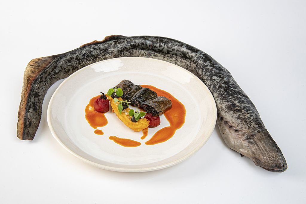El producto estrella del ayuntamiento de Pontecesures, la lamprea, se sirvió lacada en sus propios jugos, obtenidos tras un proceso de cocinado al vacío durante 3 horas a 85 grados.