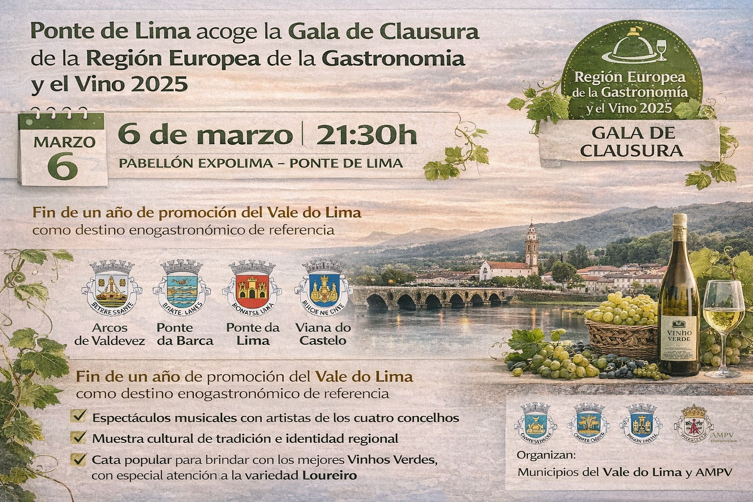 La ceremonia tendrá lugar el 6 de marzo, a las 21.30 horas, en el Pabellón de Ferias y Exposiciones – Expolima, en Ponte de Lima. El acto reunirá a los cuatro municipios del Vale do Lima en un encuentro solemne que marca el final de un ciclo de celebraciones centrado en la puesta en valor de la gastronomía, los Vinhos Verdes y el patrimonio cultural de la región.