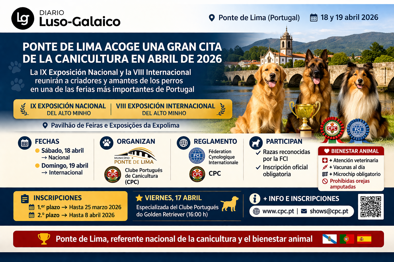 El municipio de Ponte de Lima será escenario los próximos 18 y 19 de abril de 2026 de la IX Exposición Nacional y la VIII Exposición Internacional Canina, una de las citas más destacadas del calendario de la canicultura en Portugal.