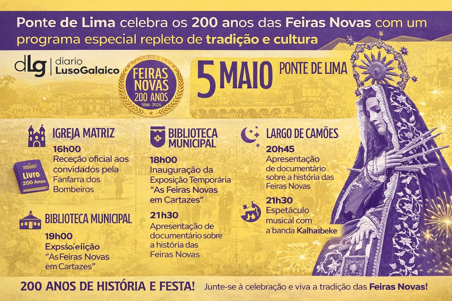 El municipio de Ponte de Lima y la Associação Concelhia das Feiras Novas conmemoran el bicentenario de una de sus señas de identidad más emblemáticas: las Feiras Novas. La celebración tendrá lugar el próximo 5 de mayo con una programación especial que combina actos institucionales, cultura y fiesta popular.