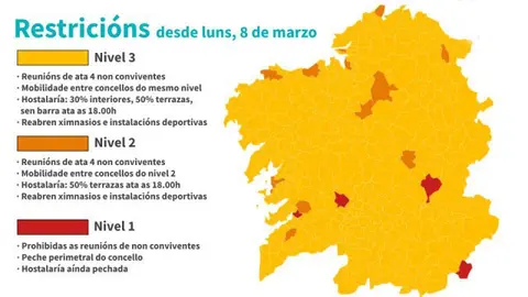 Sanidade levanta el cierre perimetral de las áreas sanitarias de Coruña y Pontevedra DL-G 6/3/21 Establece el nivel máximo de restricciones en los ayuntamientos de Boborás, Pobra de Brollón y A Mezquita