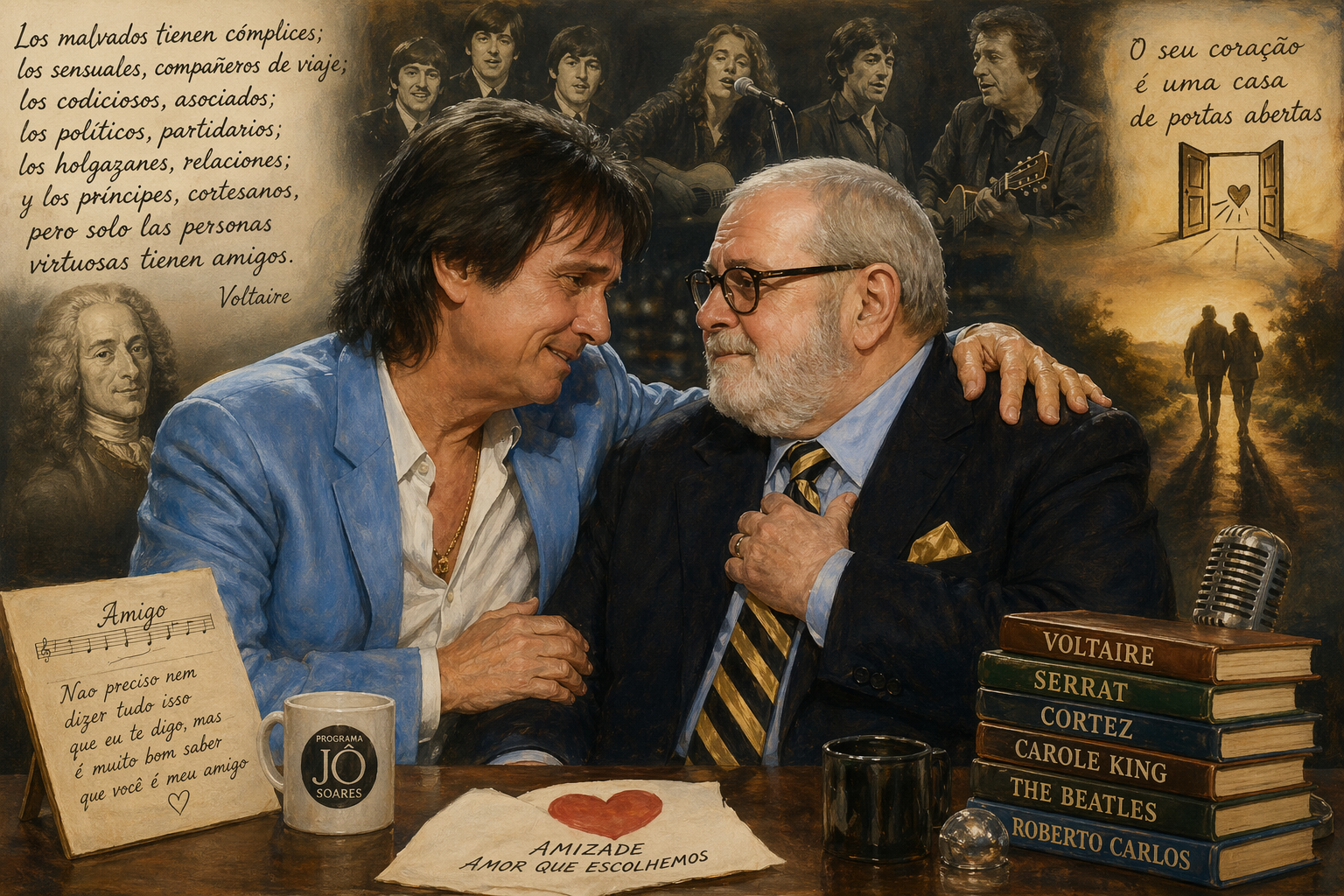 Mais cando penso en cancións sobre este asunto venme sempre á cabeza, ademais de “Un millón de amigos”, o “Amigo” de Roberto Carlos, composta orixinariamente en portugués. O cantautor brasileiro escribiuna para o seu amigo Erasmo Carlos, o seu “irmán musical” (ao cabo, un amigo é un irmán que escollemos), compositor da música da gran maioría dos seus éxitos. Pero hai en Youtube un vídeo impagable en que Roberto Carlos a canta para o humorista Jô Soares no famoso programa de televisión que tiña este. As imaxes son dunha beleza e dunha emoción indescritibles. Roberto Carlos e o Jô están sentado detrás dunha mesa. O presentador acaba de entrevistalo e anuncia ao público que o intérprete vai cantar “Amigo”. Pero Roberto Carlos rexeita levantarse e ir ata o escenario e, poñéndolle unha man no ombreiro, dille: “Non, eu vou cantar aquí ao teu lado, porque non ten sentido cantar esa canción aí. É para cantarcha de fronte, mirándote aos ollos, pois ten todo que ver contigo. Foi feita para o meu amigo Erasmo Carlos, mais xaora que podo cantala para outros amigos queridos coma ti”. E rompe a chorar de emoción, emocionando tamén o Jô. Entón dálle un bico na faciana e, con bágoas nos ollos, que seca cun pano de papel, comeza a cantar, sen deixar de mirar o seu amigo e pasándolle un brazo polas costas. O presentador quita as lentes e seca tamén os seus ollos húmidos pola emoción. Cando o intérprete canta o verso “O seu coração é uma casa de portas abertas”, golpea varias veces o peito do seu amigo e este mírao pechando momentaneamente os ollos e apretando a boca para conter a emoción. E así ata ao final. Roberto Carlos remata a peza dando un bico na despexada fronte do Jô, quen, saloucando, apenas pode despedir o programa. O retrouso da canción resúmeo todo: “Nao preciso nem dizer tudo isso que eu te digo, mas é muito bom saber que você é meu amigo”.