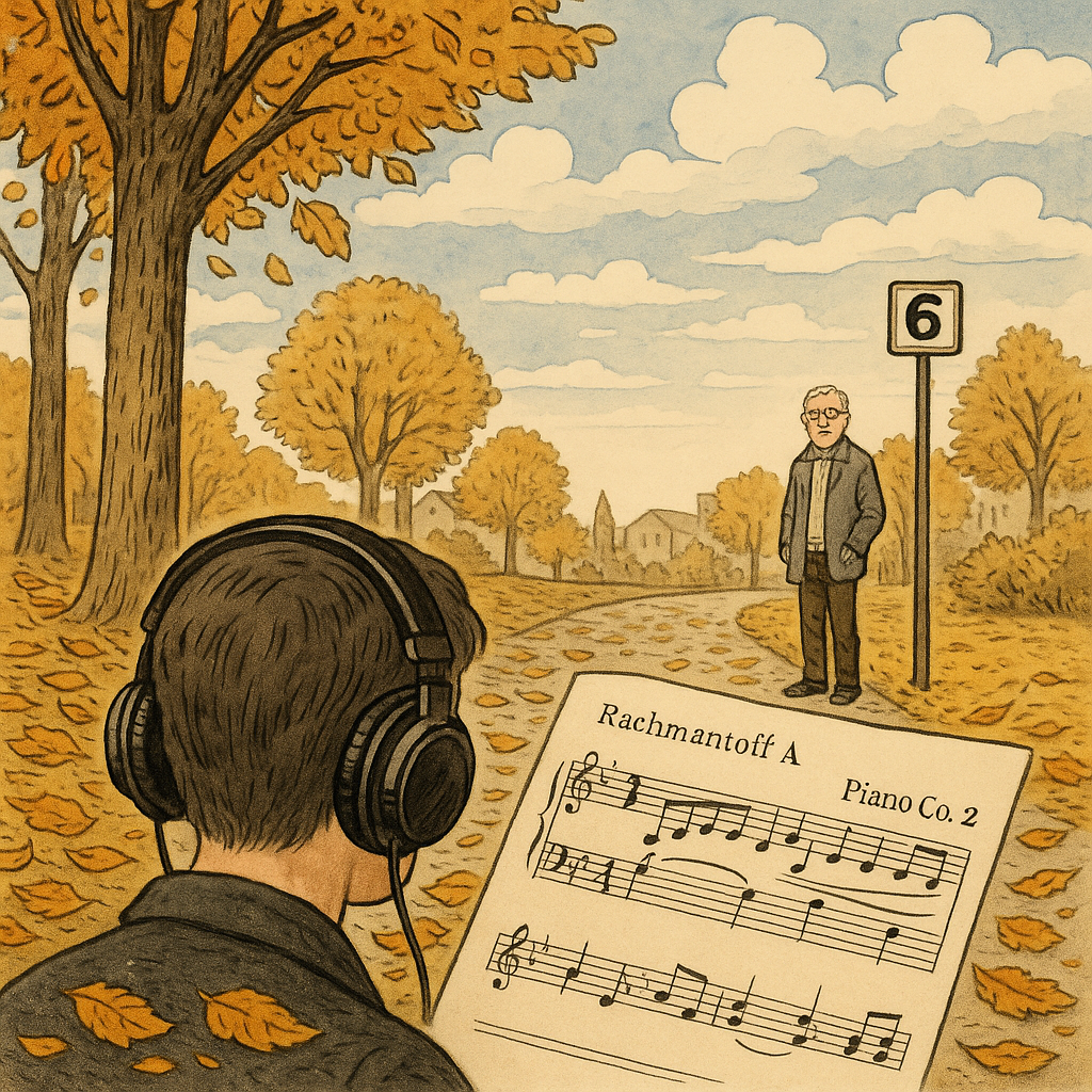 Camino dos minutos pisando hojas caídas de los olmos de Santa Clara. A través de los auriculares oigo el andante del concierto 2 para piano de Rachmaninov, plas, plas, plas… Saludo al vecino José Antonio en la parada del bus número 6, y veo nubes blancas entre cielo azul. El piano gotea unas notas alternadas con la flauta, interpretadas para mí por Lang Lang…, el mundo está bien hecho en noviembre.