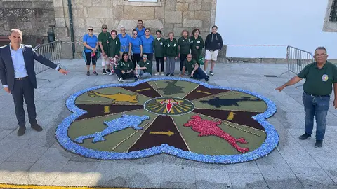 Un equipo de trece alfombristas de Ponteareas se desplazó en el día de hoy a Camariñas para confeccionar una alfombra de flores para el acto de inauguración de en la Muestra de Encaixe de Camariñas.