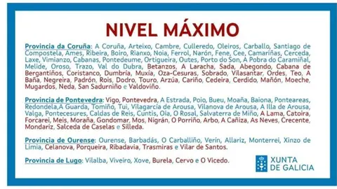 Salud El comité propone subir al nivel máximo de restricciones a 55 ayuntamientos más, entre ellos Vigo y Pontevedra DL-G 19/1/21 Galicia queda así con 115 municipios emplazados en el nivel de restricciones más elevado, lo que supone un 72% de la población